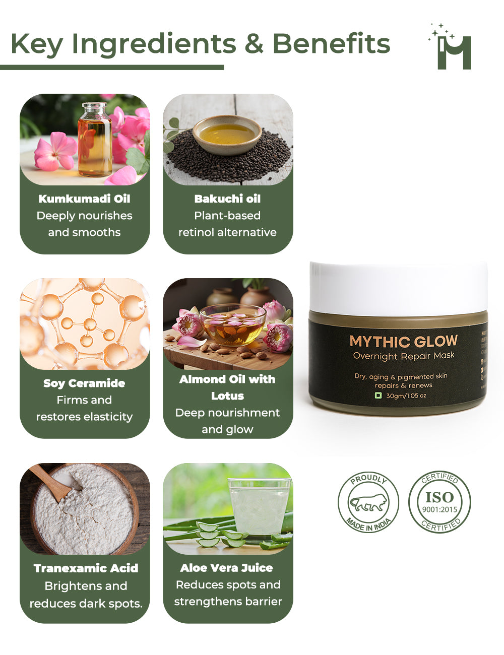 Mythic Glow works while you rest — blending Kumkumadi oil and saffron to brighten, bakuchi and almond oils to repair, and ceramides with hyaluronic acid to restore hydration overnight.
